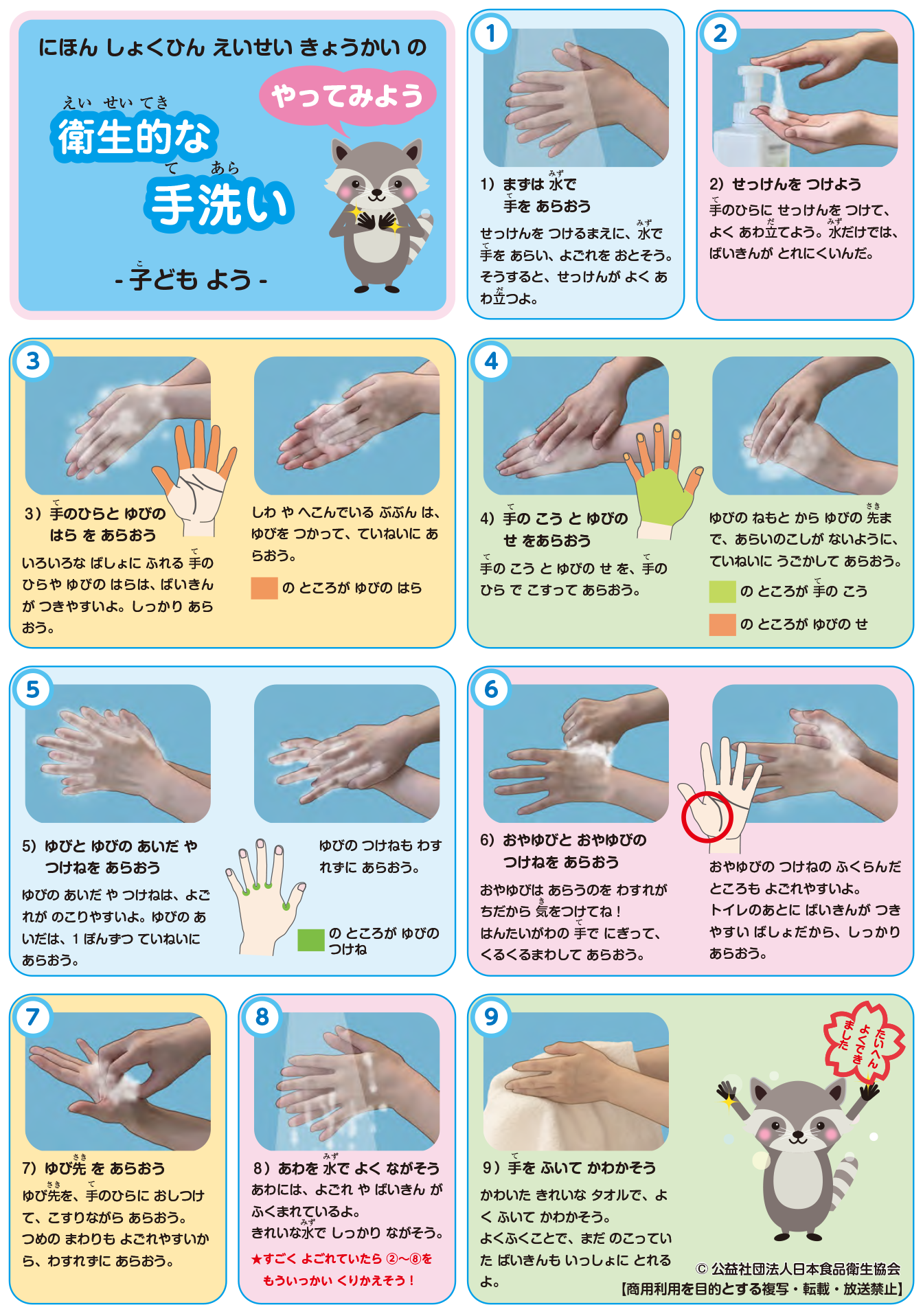 日本食品衛生協会では、きちんと洗える手洗い手順を「衛生的な手洗い」として普及活動を行っています。みなさんも、衛生的な手洗い手順できちんとした手洗いができるようになりましょう!