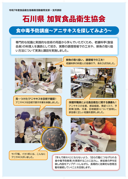 年間を通じた食品衛生普及啓発活動において、模範となりかつ顕著な活動を実施した支部・支所の食品衛生指導員による活動について「食品衛生指導員活動優秀支部・支所」として表彰しております。